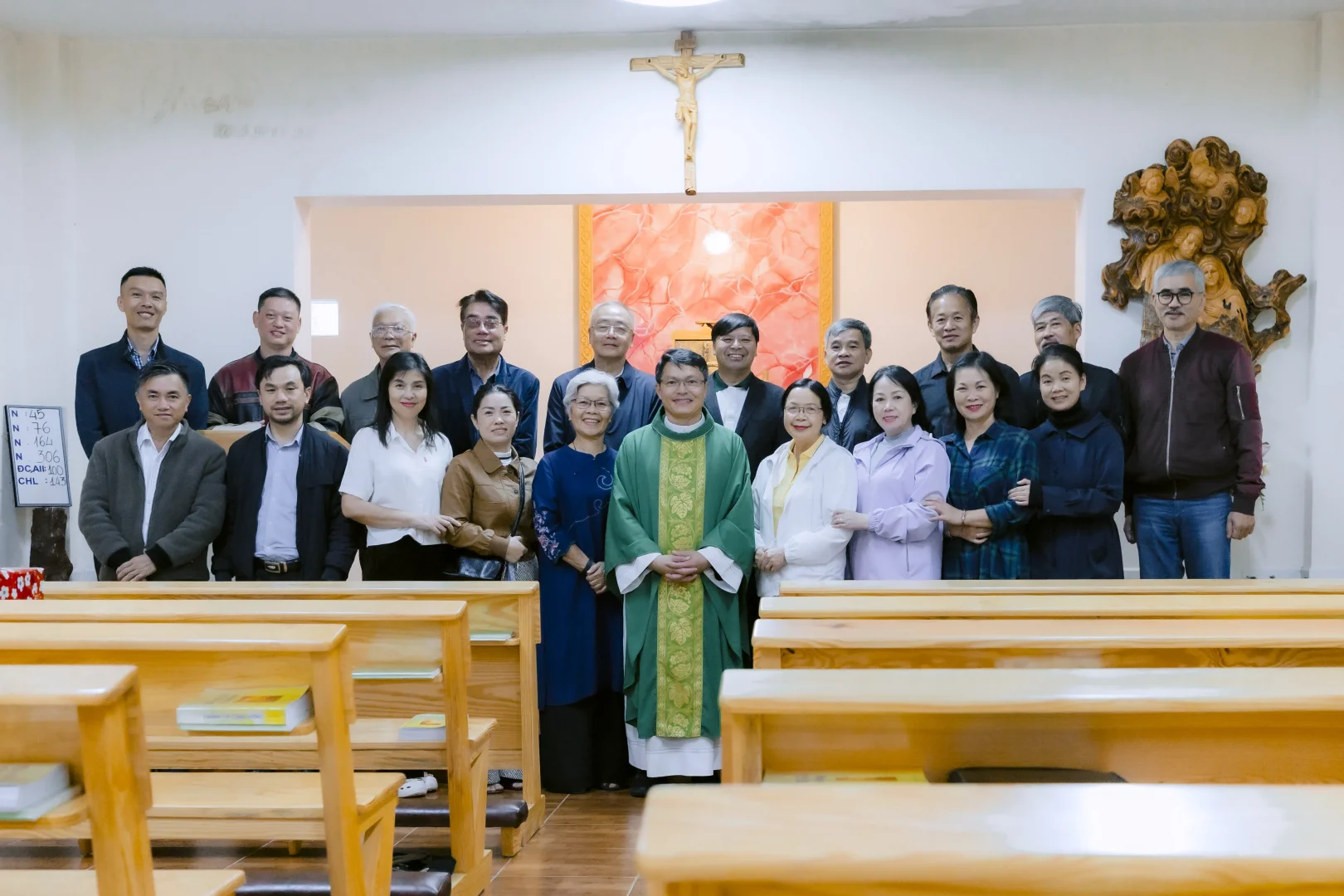 Sau đó, mọi người cùng ríu rít chụp hình lưu niệm với Cha trước cung thánh và bên ngoài nhà nguyện.