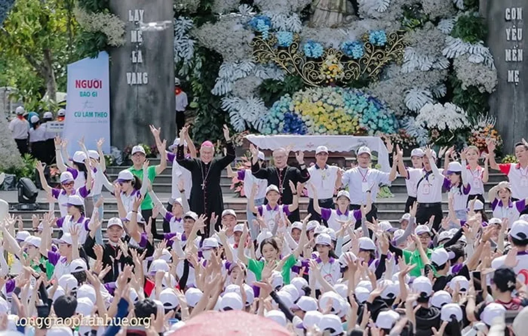 Hiện diện trong buổi chia sẻ có Đức Cha Giuse Nguyễn Chí Linh – Tổng Giám mục TGP Huế, Đức Cha Matthêu Nguyễn Văn Khôi – Giám mục Giáo phận Quy Nhơn, Đức Cha Giuse Đặng Đức Ngân – Giám mục Giáo phận Đà Nẵng, cùng quý Cha Đặc trách Giới trẻ các Giáo phận và đông đảo các bạn trẻ cũng như khách hành hương.
