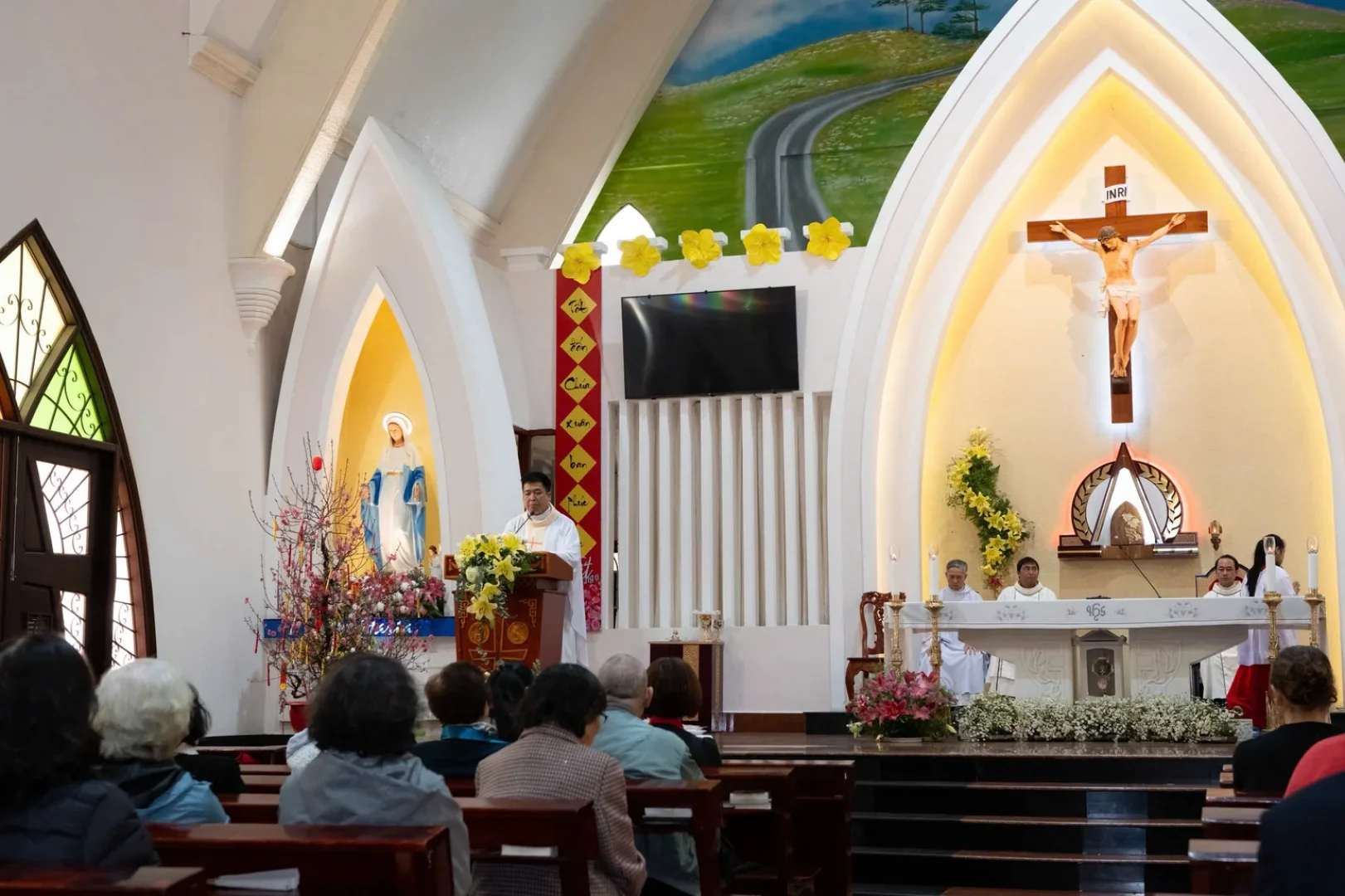 Trong bài giảng lễ, khởi đi từ Tin Mừng theo thánh Gioan thuật lại tiệc cưới Cana, Cha Quản sở Phêrô đã khắc họa sâu sắc vai trò của Đức Maria. Mẹ không chỉ là một phụ nữ Do Thái hiện diện trong tiệc cưới, mà còn là Đấng Trung Gian của Giao ước mới.