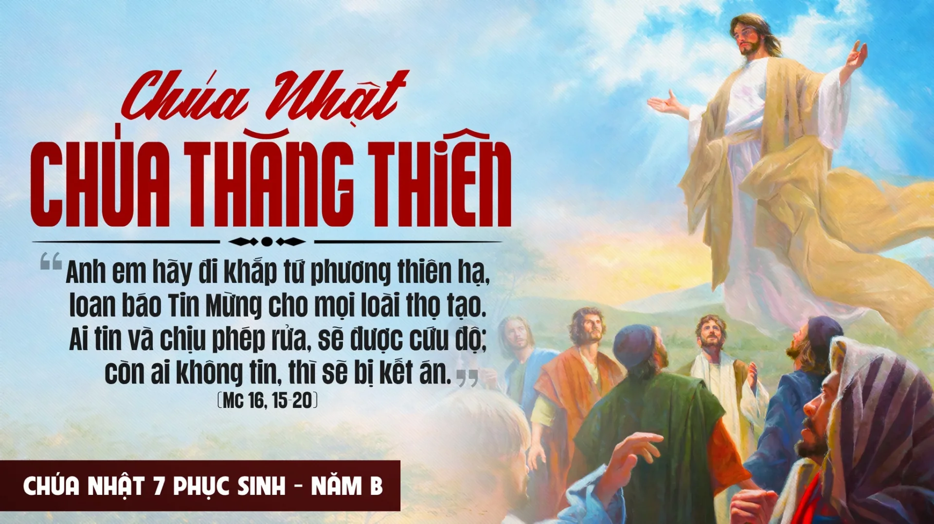 Biến cố Thăng Thiên là điều kiện của biến cố Ngũ Tuần; Chúa Thánh Thần ngự xuống sẽ biến đổi các Tông Đồ và thúc đẩy họ bắt tay hành động. Các thiên sứ đã mời gọi họ rồi: “Hỡi những người Ga-li-lê, sao còn đứng nhìn lên trời? Đức Giê-su, Đấng vừa lìa bỏ các ông và được rước lên trời, cũng sẽ ngự đến y như các ông đã thấy Người lên trời”. Nhưng phải chuẩn bị ngày Ngài trở lại nầy bằng cách bắt đầu công việc truyền giáo vĩ đại mà Tin Mừng hôm nay nhắc nhở chúng ta.