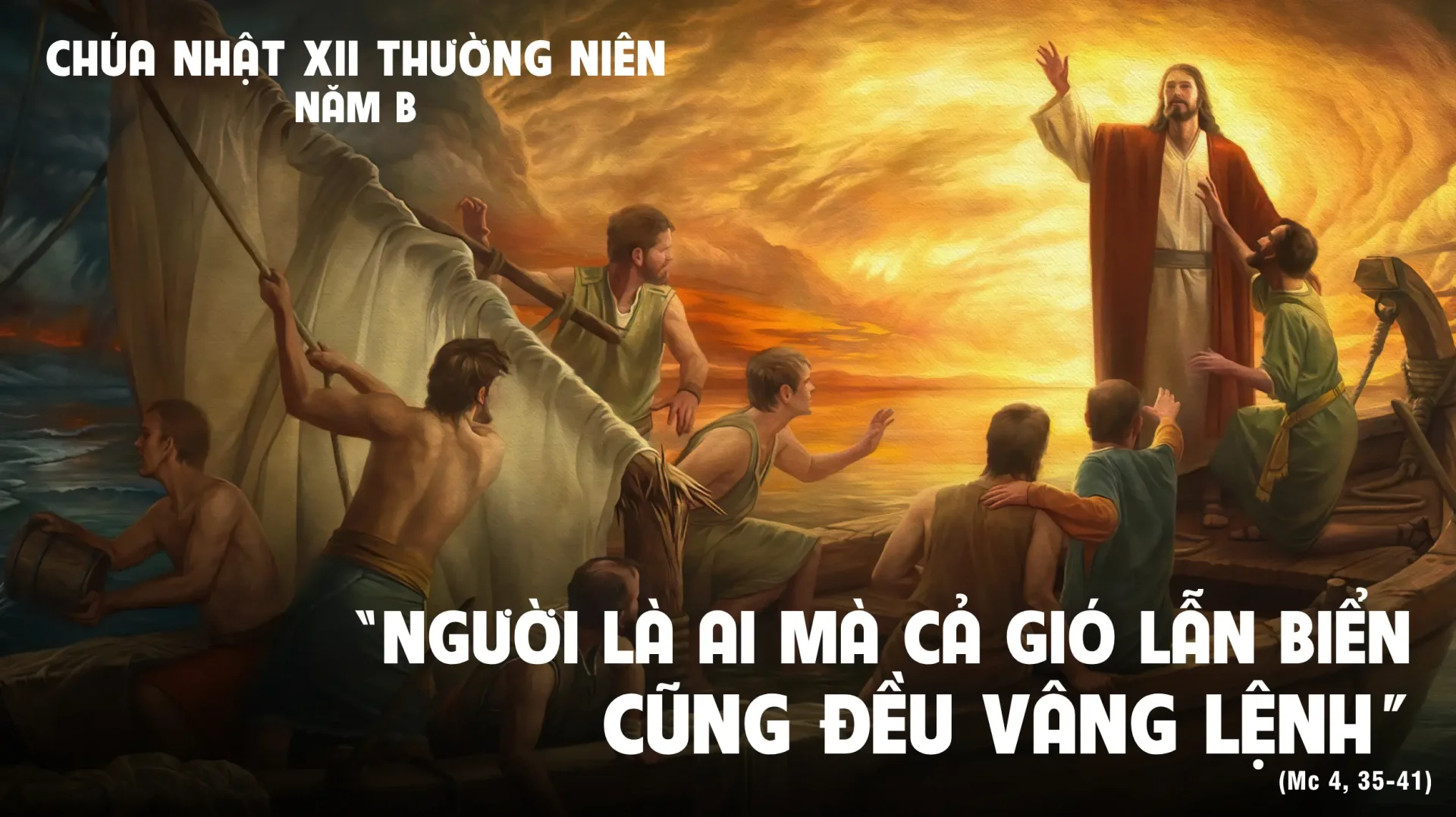 Vì thế, một cơn sóng gió nổi lên hầu nhận chìm con thuyền của các ông mà Đức Giêsu thì nằm ở đàng lái mà ngủ, coi như không có chuyện gì xẩy ra. Các môn đệ vừa cầu cứu vừa có vẻ hơi trách móc Ngài. Lúc ấy Ngài mời bình tĩnh đứng lên, truyền lệnh cho sóng gió phải ngưng hoạt động, tức thì gió im, biển trở nên lặng như tờ. Trước cảnh tượng này các môn đệ hết sức kinh ngạc và thán phục Đức Giêsu nên mới nói với nhau:”Ngài là ai mà cả gió và biển đều phải tuân lệnh Ngài” ? Các ông đã nhìn ra quyền năng của Ngài và tin tưởng vào Ngài hơn.