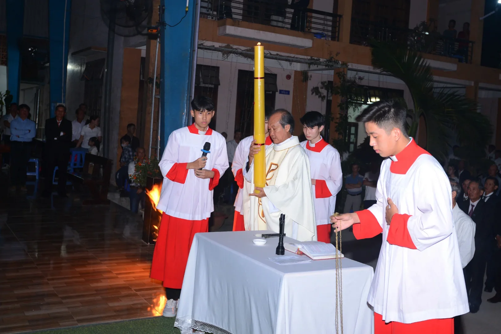Vào lúc 19 giờ, Cha Quản xứ Tôma Trần Trung Phát cùng với quý Tu sĩ và cộng đoàn Dân Chúa tụ họp tại hội trường, bắt đầu nghi thức làm phép lửa mới, chuẩn bị nến Phục Sinh và công bố Tin Mừng Phục Sinh. Hàng ngàn tiếng đáp “Tạ Ơn Chúa” vang lên sau mỗi lần xướng ÁNH SÁNG CHÚA KITÔ của chủ tế.
