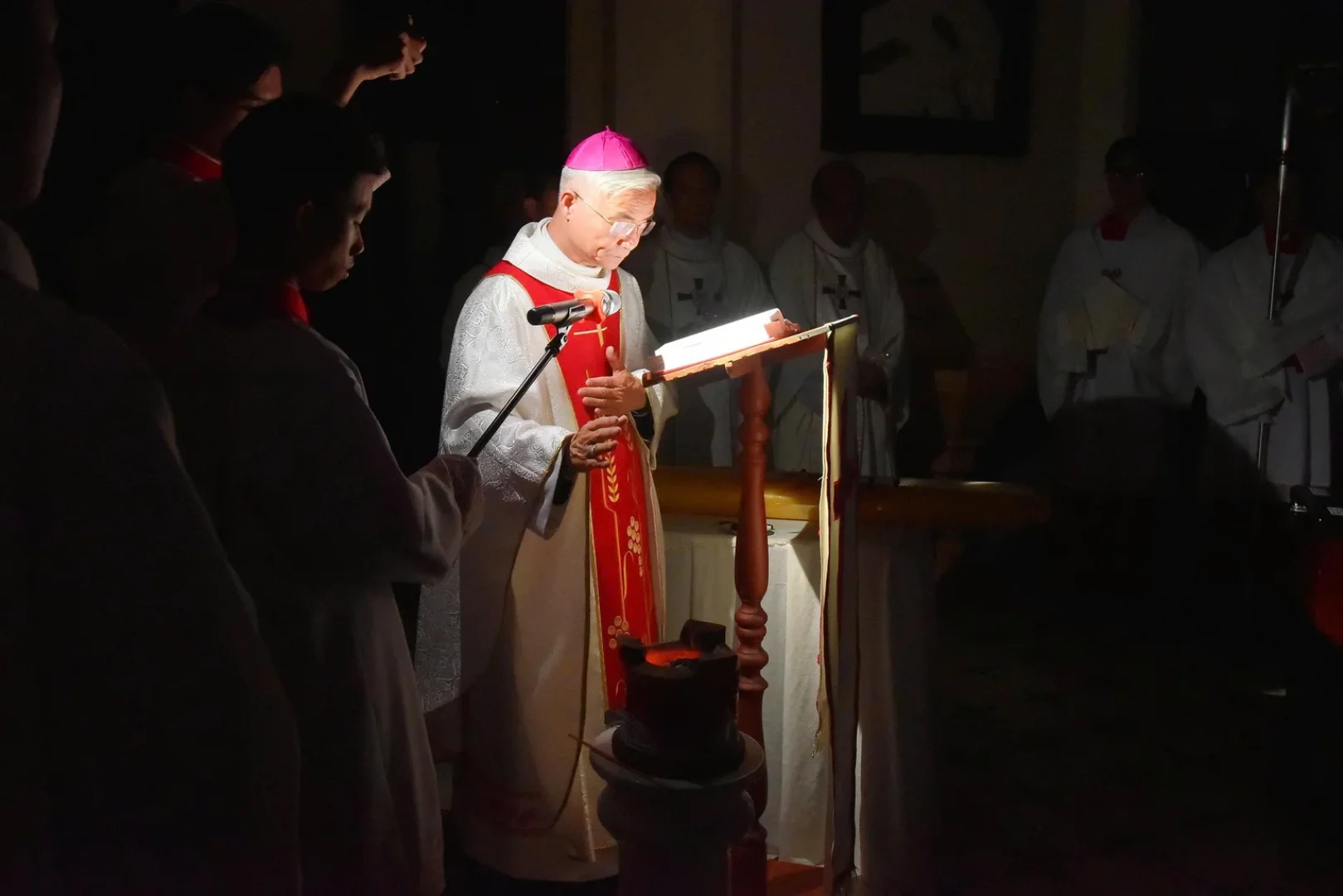 Từ cây nến Phục Sinh, ánh sáng được lan tỏa đến từng ngọn nến nhỏ trong tay cộng đoàn, dần xua tan bóng tối của đêm đen. Ba lần Đức Giám mục long trọng xướng: “Ánh sáng Chúa Kitô”, cộng đoàn cung kính đáp lại: “Tạ ơn Chúa”, như một lời tuyên xưng niềm tin và lòng thờ phượng sâu sắc.
