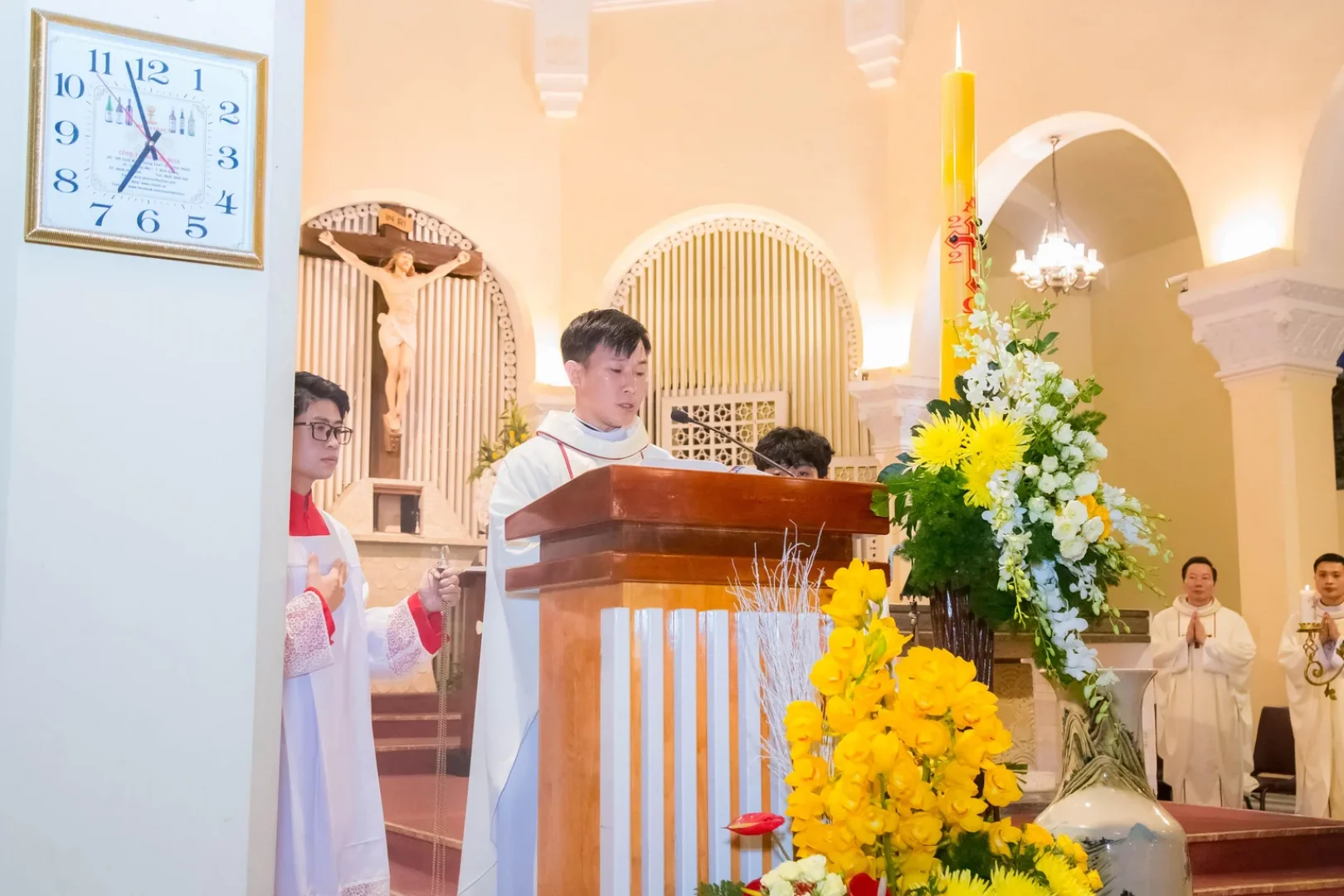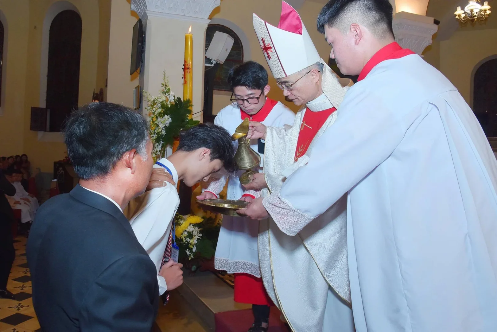 Đồng tế với Đức Cha có Cha Quản hạt Phaolô Phạm Công Phương, Cha phó Giuse cùng quý cha. Hiệp dâng Thánh lễ có sự hiện diện của quý tu sĩ nam nữ, các hội đoàn và đông đảo cộng đoàn dân Chúa. Đặc biệt, trong đêm cực thánh này, cộng đoàn hân hoan chào đón 13 anh chị em dự tòng và 2 anh chị em lãnh nhận Bí tích Thêm Sức.
