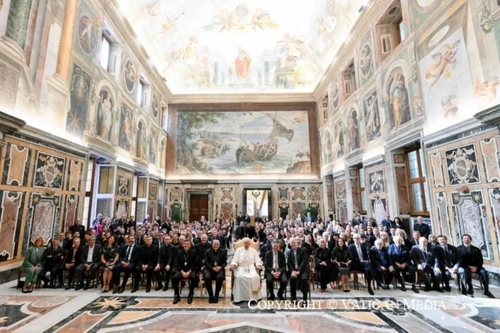 Các bạn thân mến, xin Thiên Chúa chúc lành cho các bạn và nghệ thuật của các bạn. Hãy tiếp tục cổ võ mọi người, đặc biệt là những người cảm thấy khó khăn nhất khi nhìn cuộc sống với niềm hy vọng. Hãy giúp chúng tôi mỉm cười khi nhìn thực tế với những mâu thuẫn của nó và mơ về một thế giới tốt đẹp hơn! Tôi ưu ái ban phép lành cho các bạn; và xin các bạn hãy cầu nguyện cho tôi.