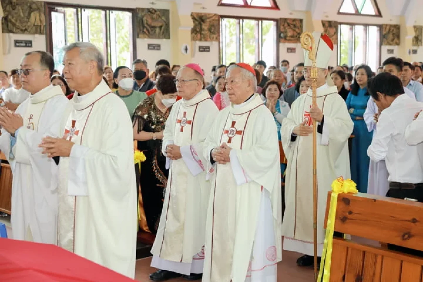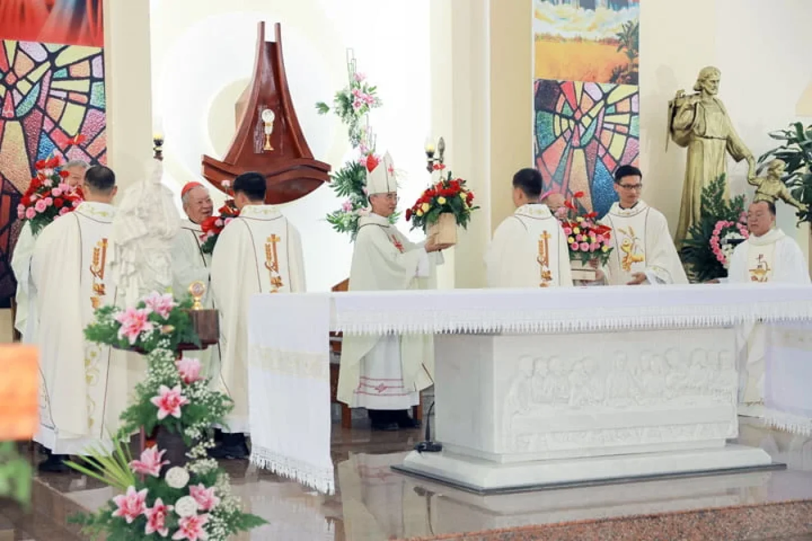 Chủ tế Thánh lễ là Đức Cha Đaminh Nguyễn Văn Mạnh, Giám mục Giáo phận Đà lạt, với sự đồng tế của Đức Hồng Y Phêrô Nguyễn Văn Nhơn, Đức Cha Antôn Vũ Huy Chương, Cha Tổng Đại diện Gioan Boscô Hoàng Văn Chính, quý Cha Bề trên Dòng cùng 80 Linh mục trong và ngoài giáo phận. Đông đảo giáo dân xa gần cũng về tham dự thánh lễ, cầu nguyện cho ơn gọi, chung vui với hội dòng và gia đình các tiến chức.