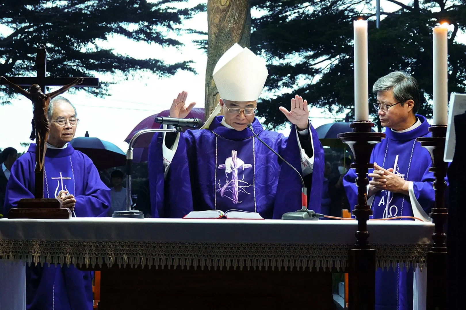 Ngỏ lời với cộng đoàn phụng vụ gồm đông đảo các Tu sĩ nam nữ và giáo dân, Đức cha mời gọi cầu nguyện cho các Đấng bậc trong giáo phận đã qua đời, cho những Linh mục, Tu sĩ đang yên nghỉ tại nghĩa trang này, cách đặc biệt cho 3 Cha mới qua đời trong năm: Cha Cố Giuse Vũ Đình Tân, Cha Cố Phêrô Phan Năng Hưởng và Cha Cố Matthêu Đinh Viết Hoàng. Đức cha cũng xin cầu cho các tín hữu đã qua đời, cho cả những người chưa được Rửa tội, vì “chỉ một mình Chúa mới biết lòng tin của họ”.
