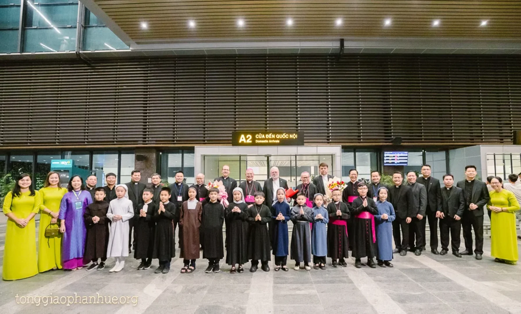 Đón phái đoàn tại sân bay, có Đức Cha Giuse Nguyễn Chí Linh – Tổng Giám mục TGP Huế, Đức Cha Giuse Đặng Đức Ngân – Tổng Giám mục Phó TGP Huế, Đức Ông Antôn Dương Quỳnh – Tổng Đại diện, Đức Ông Giuse Nguyễn Văn Chánh – Đại diện Giám mục, cùng quý Cha, quý Thầy trong Tổng Giáo phận và một số anh chị em giáo dân.