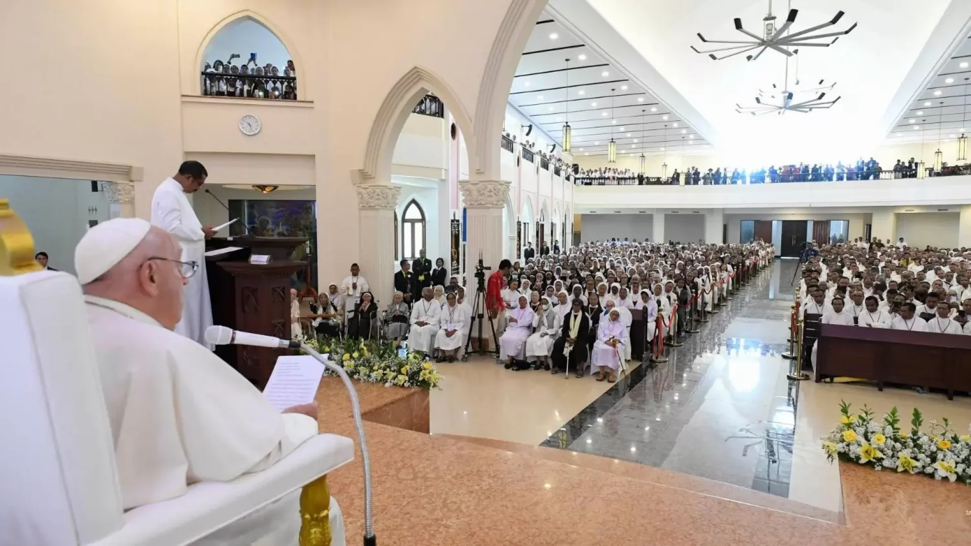Thứ Ba ngày 10/9/2024, ngày thứ hai trong chuyến tông du tại Đông Timor của Đức Thánh Cha. Sau khi thăm các trẻ em khuyết tật của trường “Irmãs Alma”, vào lúc 9 giờ 15’, Đức Thánh Cha đi xe Nhà thờ Chính toà Đức Mẹ Vô Nhiễm, cách đó khoảng 4,4 km để gặp các giám mục, linh mục, phó tế, tu sĩ nam nữ, chủng sinh và giáo lý viên.