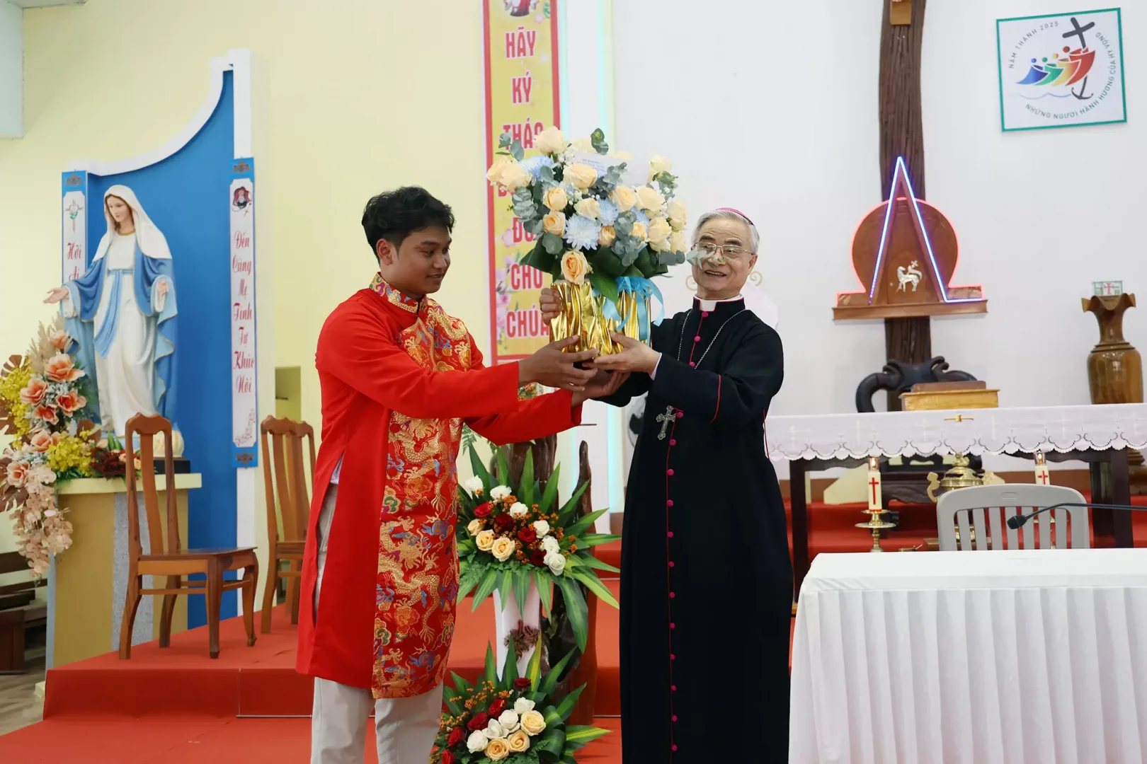 Sau bài chia sẻ của Đức cha Đaminh, Cha Quản hạt Batôlômêô Nguyễn Văn Gioan đại diện cho Giáo hạt đã nói lên những tâm tình, lời chúc gói ghém trong những bó hoa tươi thắm của cộng đoàn dâng lên Đức cha và Cha Quản lý. Hoà chung trong niềm vui ấy Cha Đaminh Nguyễn Ngọc Trang quản xứ Romen đã đại diện cho các Cha trong Giáo hạt chúc tết và có bó hoa tươi thắm dâng lên cha Quản hạt.