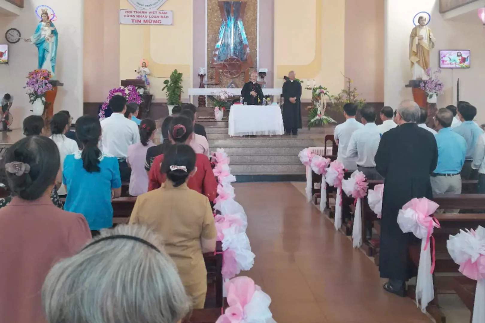 Tiếp theo, Cha Tổng đại diện thay mặt Đức cha đáp từ và gửi lời chúc Tết đến toàn thể cộng đoàn hiện diện. Ngài chúc quý Cha, quý Tu sĩ nam nữ và bà con giáo dân một năm mới tràn đầy niềm vui, hạnh phúc và bình an trong Chúa. Cha Tổng đại diện cũng khích lệ mọi người tiếp tục sống và thực thi sứ mạng loan báo Tin Mừng, góp phần xây dựng Giáo hội ngày càng thăng tiến.