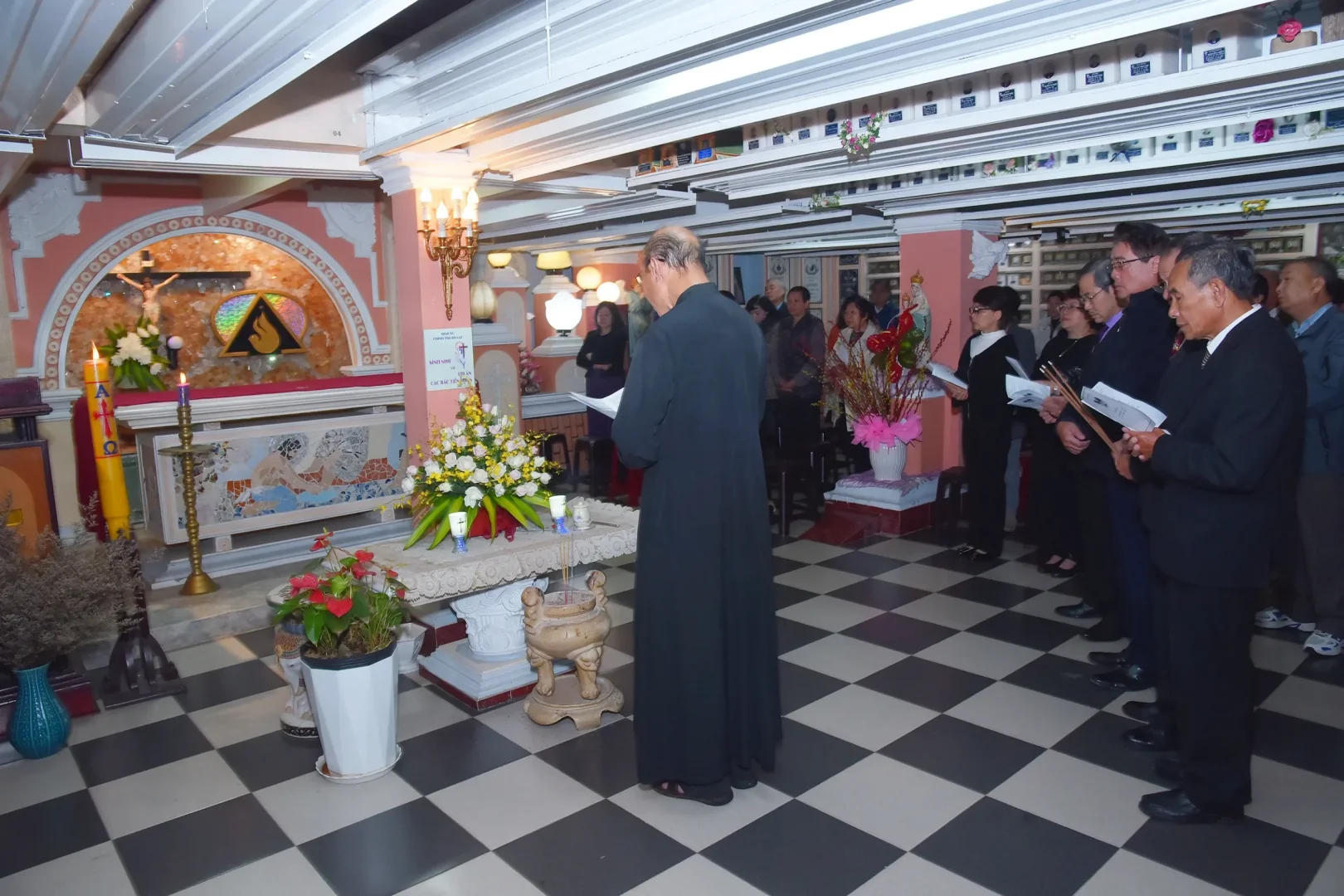Sau Thánh lễ, Cha Quản xứ và cộng đoàn quy tụ tại nhà từ đường, nơi lưu giữ tro cốt của nhiều thế hệ trong và ngoài giáo xứ. Quả là một khoảnh khắc thiêng liêng, khi Giáo Hội lữ hành và Giáo Hội thanh luyện được liên kết trong tình thương của Thiên Chúa và niềm hy vọng vào sự sống đời đời. Không còn ranh giới “người thân của riêng ai”, nhưng trong bầu khí thân tình của một gia đình, cộng đoàn cùng dâng lời cầu nguyện cho tất cả những người đã qua đời: ông bà, cha mẹ, người thân ruột thịt; các giám mục, linh mục; các tu sĩ nam nữ; bạn bè, người thân quen; các nạn nhân của chiến tranh, thiên tai, dịch bệnh; các quý chức từng hy sinh phục vụ giáo xứ; các thai nhi chưa kịp chào đời; và những người cô đơn không còn ai nhớ đến.