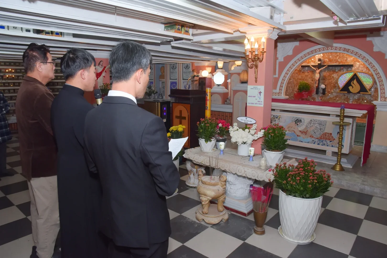 Sau bàn tiệc Thánh Thể, trong niềm xúc động trào dâng, Cha chủ tế cùng cộng đoàn đã tiến về Nhà Từ đường Phục Sinh. Những nén hương trầm nghi ngút tỏa bay hòa cùng lời kinh tha thiết, cộng đoàn dâng lên Thiên Chúa lời nguyện cầu cho các vị Mục tử đã từng coi sóc giáo xứ, cho tổ tiên, ông bà cha mẹ và các đẳng linh hồn đã an nghỉ.