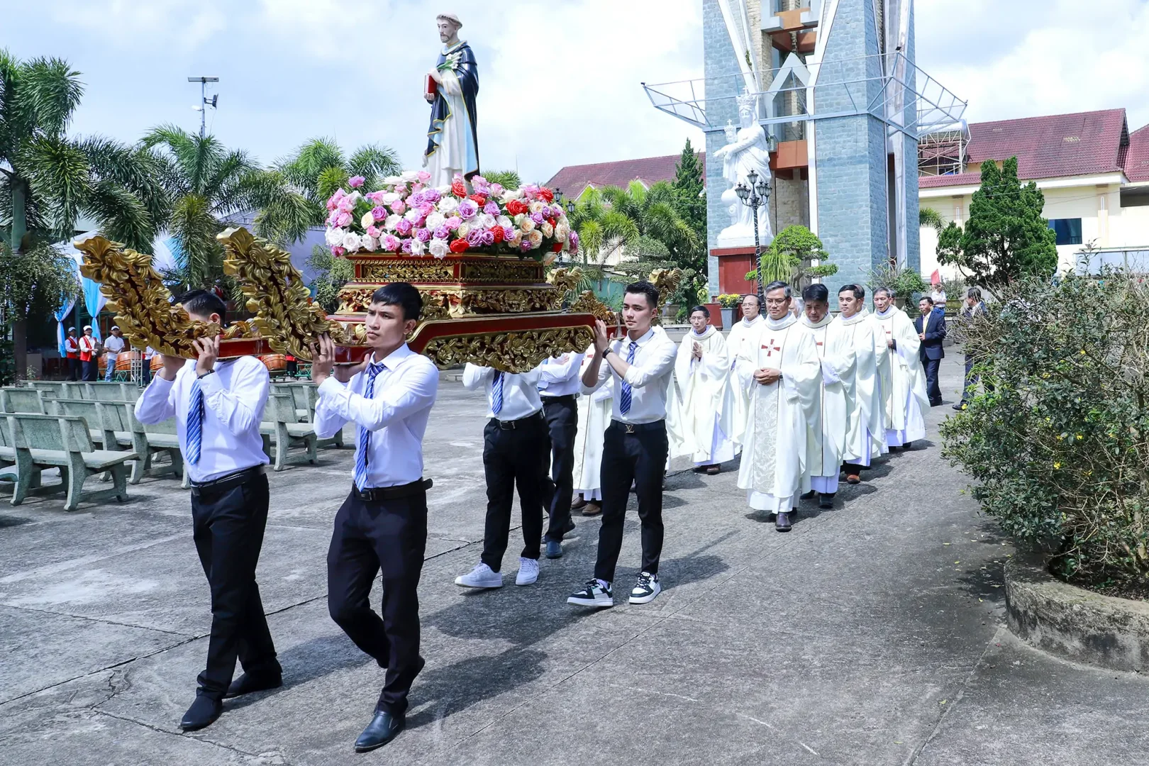 Thánh lễ bắt đầu với nghi thức tôn vinh và cung nghinh tượng thánh Đa Minh vào nhà thờ.
