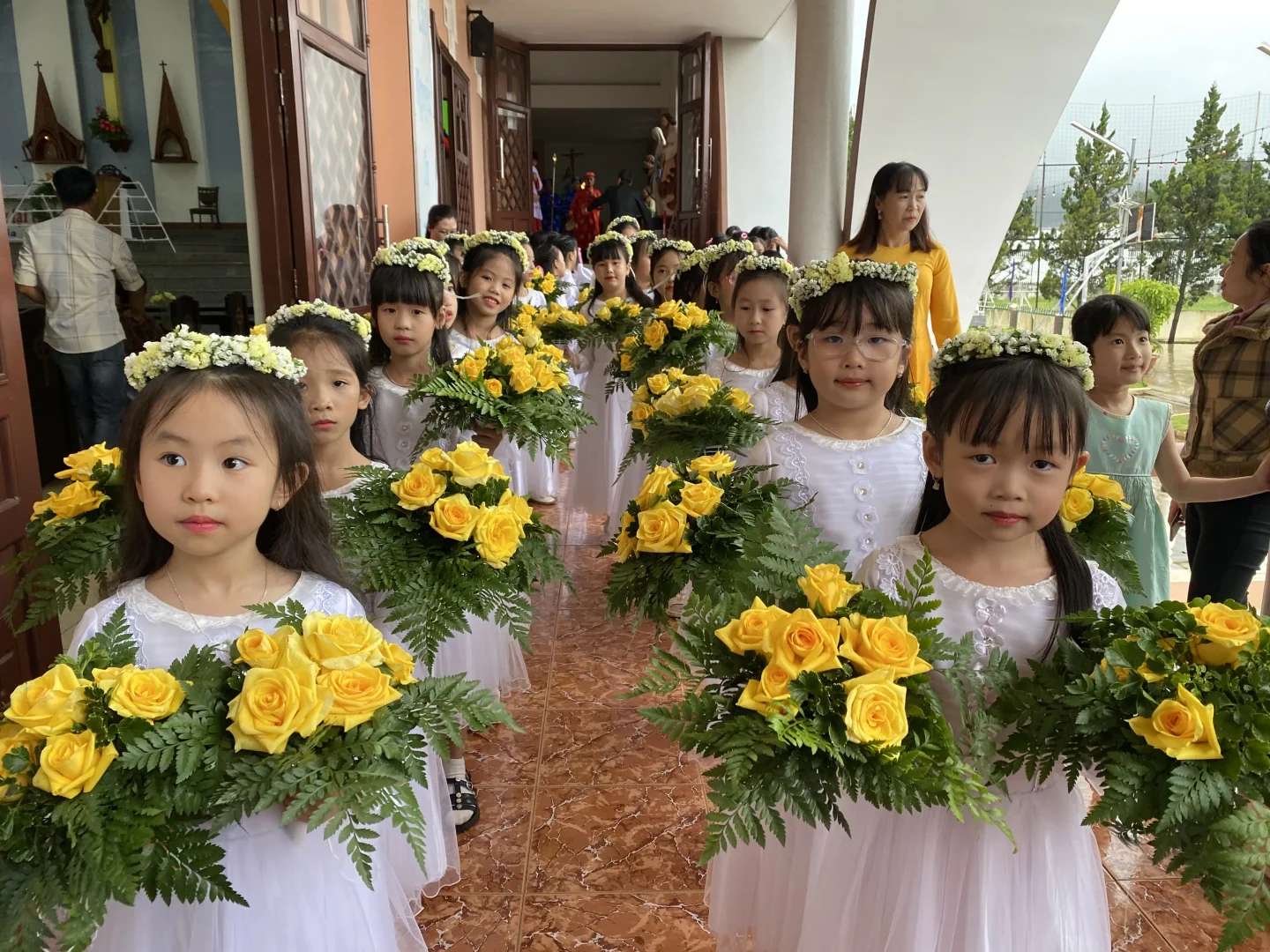 Trước giờ lễ, Cha Quản xứ Giuse và cộng đoàn đã long trọng rước kiệu Mẹ Phù Hộ và đốt những lá thư gửi Mẹ. Tiếp đến, các em thiếu nhi và cộng đoàn đã dâng lên Mẹ những đoá hoa tươi thắm, thể hiện lòng kính yêu và biết ơn sâu sắc. Nghi thức dâng hoa kết hợp với những bài thánh ca tạo nên một không gian linh thiêng và ấm cúng.