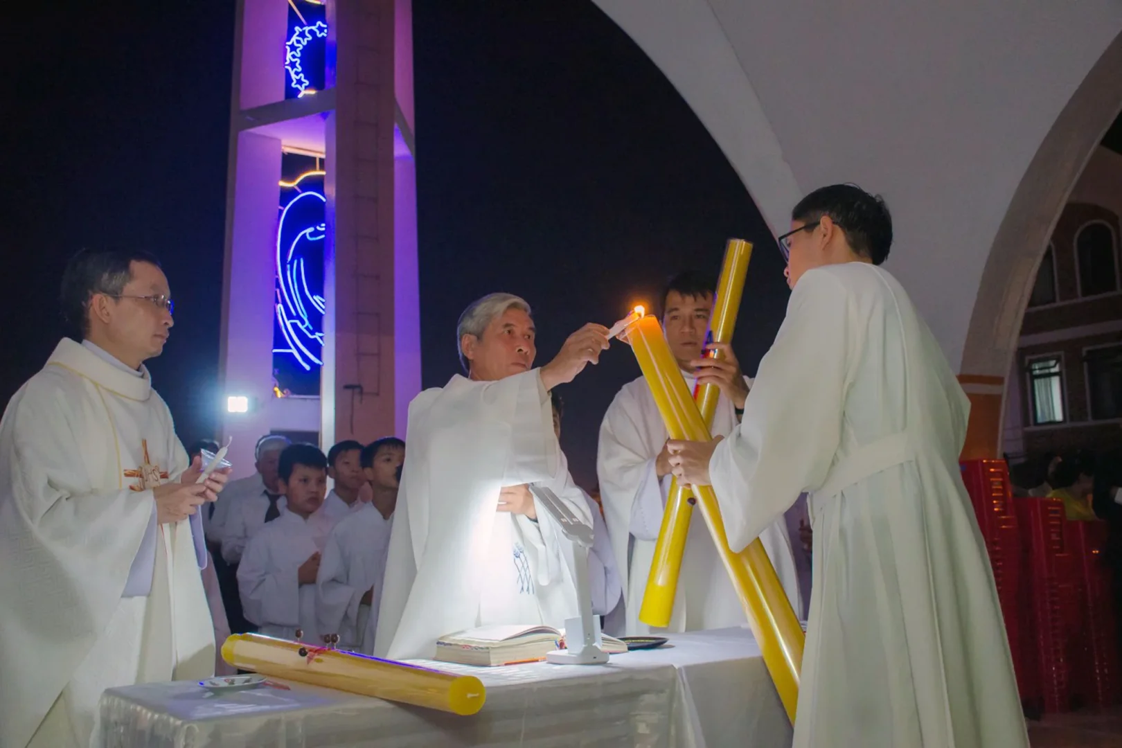 Mở đầu là nghi thức thắp nến Phục Sinh diễn ra tại tiền sảnh nhà thờ. Cha Chủ tế đã làm phép lửa mới, làm phép nến, thắp sáng nến Phục Sinh và kiệu nến vào cung thánh. Cộng đoàn thắp sáng nến cầm trên tay bằng lửa nhận từ Nến Phục Sinh và lắng nghe Tin Mừng Phục Sinh được thừa tác viên long trọng công bố.