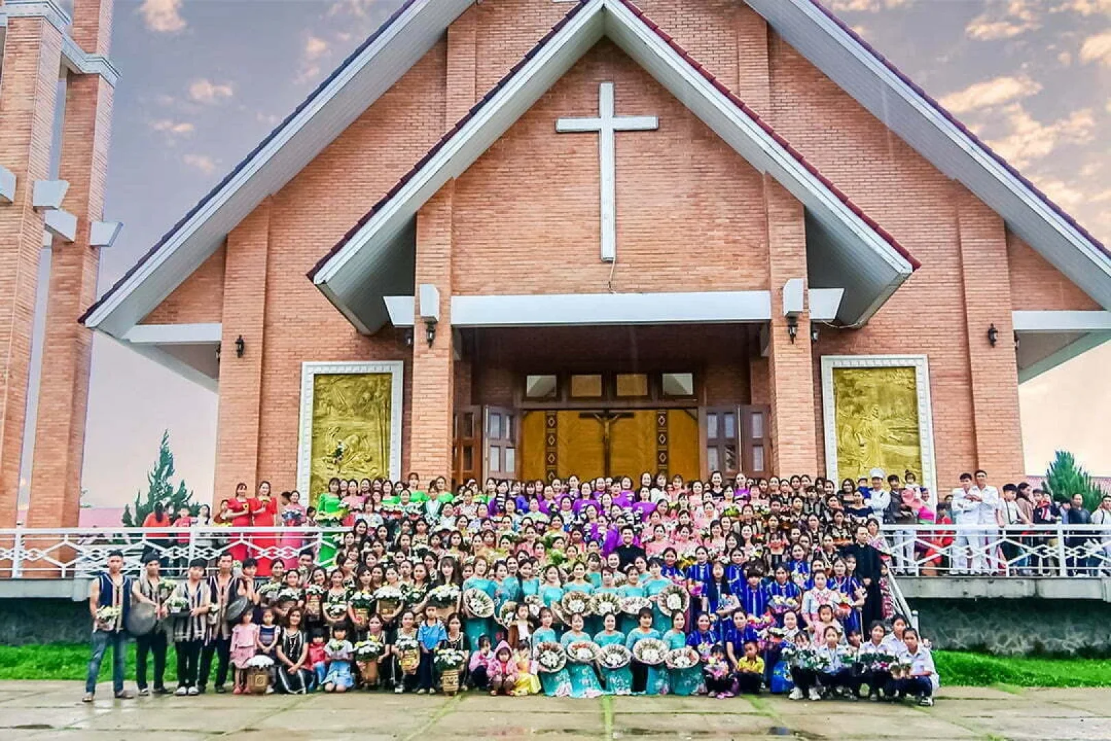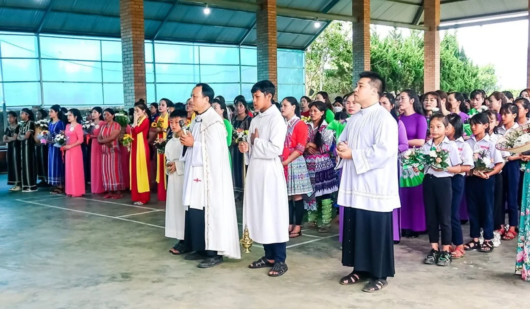 Tiếng nhạc, tiếng kèn, tiếng trống cùng với tiếng hát tạo nên khung cảnh uy nghiêm cho ngày kết thúc tháng hoa. Vào trong nhà thờ, những bài thánh ca, những bông hoa tươi đẹp, đã được các em và đội hoa – trong những bộ trang phục truyền thống của người đồng bào nơi đây – dâng lên Mẹ Maria. Đó là hoa của lời tạ ơn, hoa của sự hi sinh khiêm nhường và của lòng trông cậy vững tin nơi Mẹ.