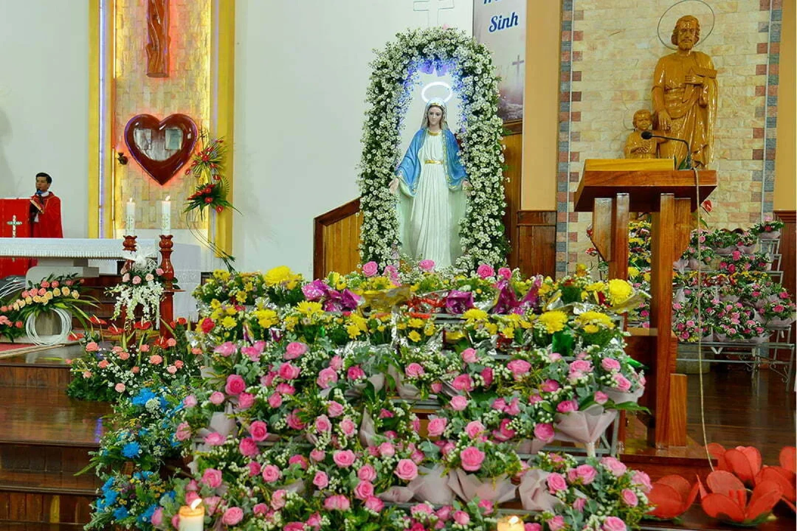 Các đội hoa của Giáo xứ đại diện cộng đoàn tiến dâng lên Mẹ những đóa hoa đầy lòng sốt mến. Từ những đóa hoa tươi, những làn hương thơm ngát, những ánh nến lung linh, đến những dải quạt mềm mại và những điệu múa uyển chuyển, tất cả đã tạo nên một bầu khí thánh thiện biểu lộ tấm lòng của đoàn con thảo hiếu với Mẹ.