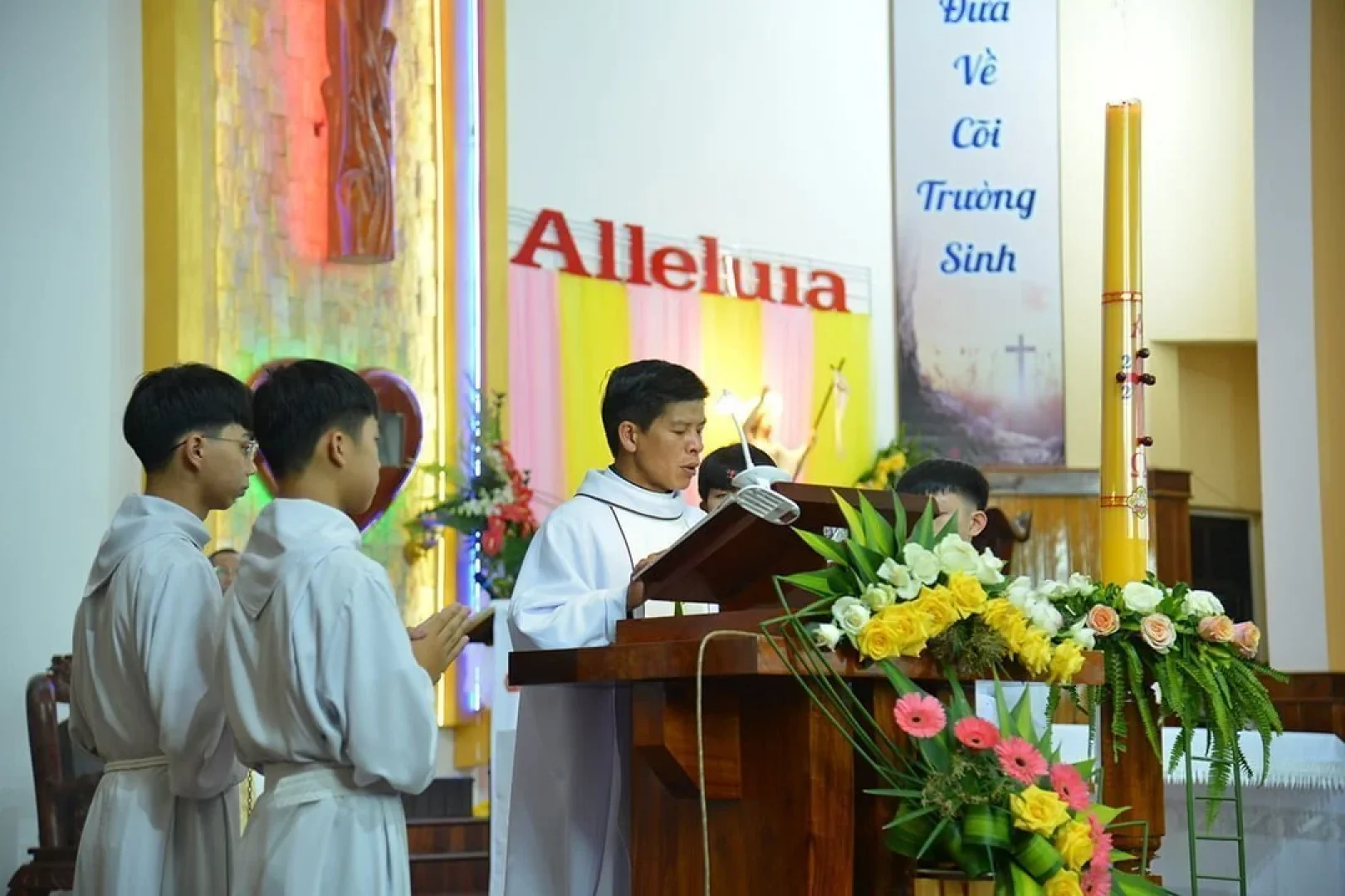 Lúc 19g00 ngày 08.04.2023, đêm thánh Vọng Phục Sinh được cử hành tại tiền sảnh nhà thờ, Cha Quản xứ Micae đã làm phép lửa mới, làm phép nến và trang trọng ghi biểu tượng của Chúa Kitô trên nến Phục Sinh. Chúa Kitô là ánh sáng chiếu soi trần gian. Nến Phục sinh truyền đi sứ điệp: Chúa Giêsu Kitô đã sống lại. Ngài đã chiến thắng sự chết, sự sống lại đã xóa tan bóng tối sự dữ tội lỗi. Cộng đoàn được mời gọi thắp sáng và rước Nến Phục sinh tiến vào nhà thờ. Sau phần công bố Tin mừng Phục Sinh, mọi người lắng nghe Lời Chúa, thuật lại công trình Cứu Độ từ Cựu Ước đến Tân Ước. Đến phần Phụng vụ Phép Rửa, công đoàn tham dự nghi thức làm phép Nước – Rảy Nước Thánh trên mình, giúp nhớ lại ơn tái sinh trong Bí tích Rửa Tội. Thánh lễ tiếp tục với phần Phụng vụ Thánh Thể.