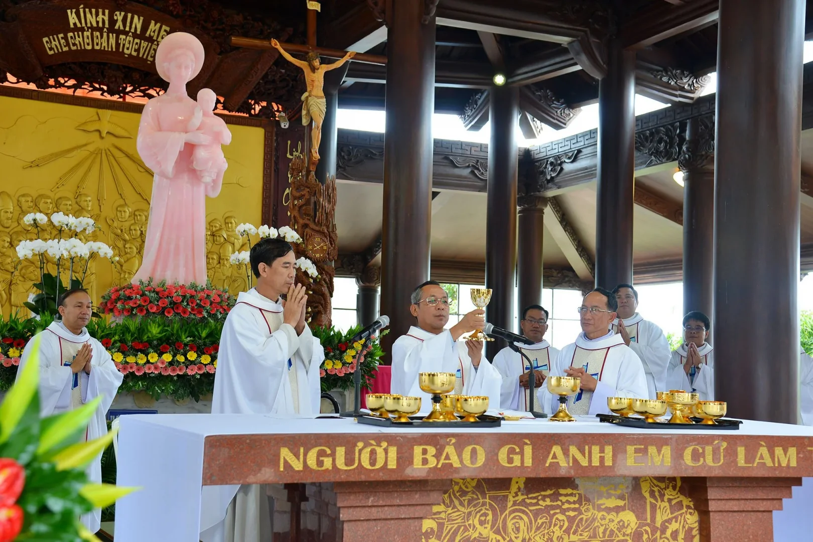 Đỉnh cao của cuộc hành hương là Thánh lễ do Cha Micae Nguyễn Quốc Tĩnh quản xứ Giáo xứ Suối Mơ chủ tế, cùng với Cha tân Quản xứ La Vang – Giuse Trần Hữu Trí – và quý Cha đồng tế; quý Tu sĩ nam nữ, và cộng đoàn dân Chúa tham dự.