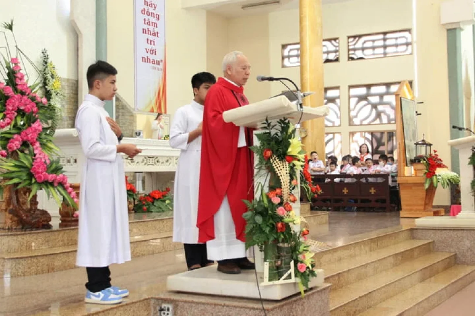 Trong Thánh lễ, Ngài nhắn nhủ các em thiếu nhi rằng: ” Hãy luôn chăm ngoan, vâng lời, siêng năng đến với Chúa và can đảm sống làm chứng cho Chúa Kitô giữa đời thường như các Thánh Tử Đạo năm xưa.”