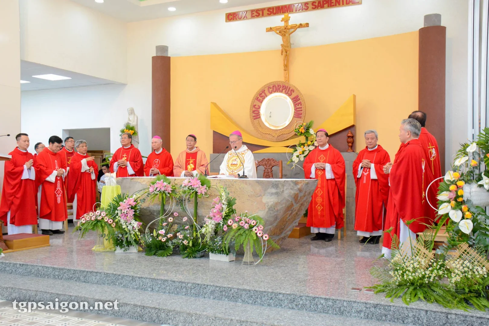 Thánh lễ tạ ơn lúc 10g30, do Đức Tổng Giám mục Giuse Nguyễn Chí Linh chủ tế lễ Suy tôn Thánh giá, với ý lễ tạ ơn Chúa. Đồng tế có quý Giám mục và hơn 30 linh mục.