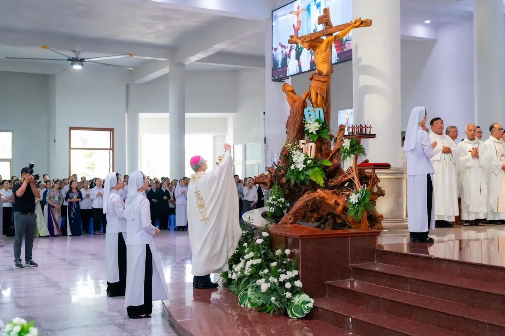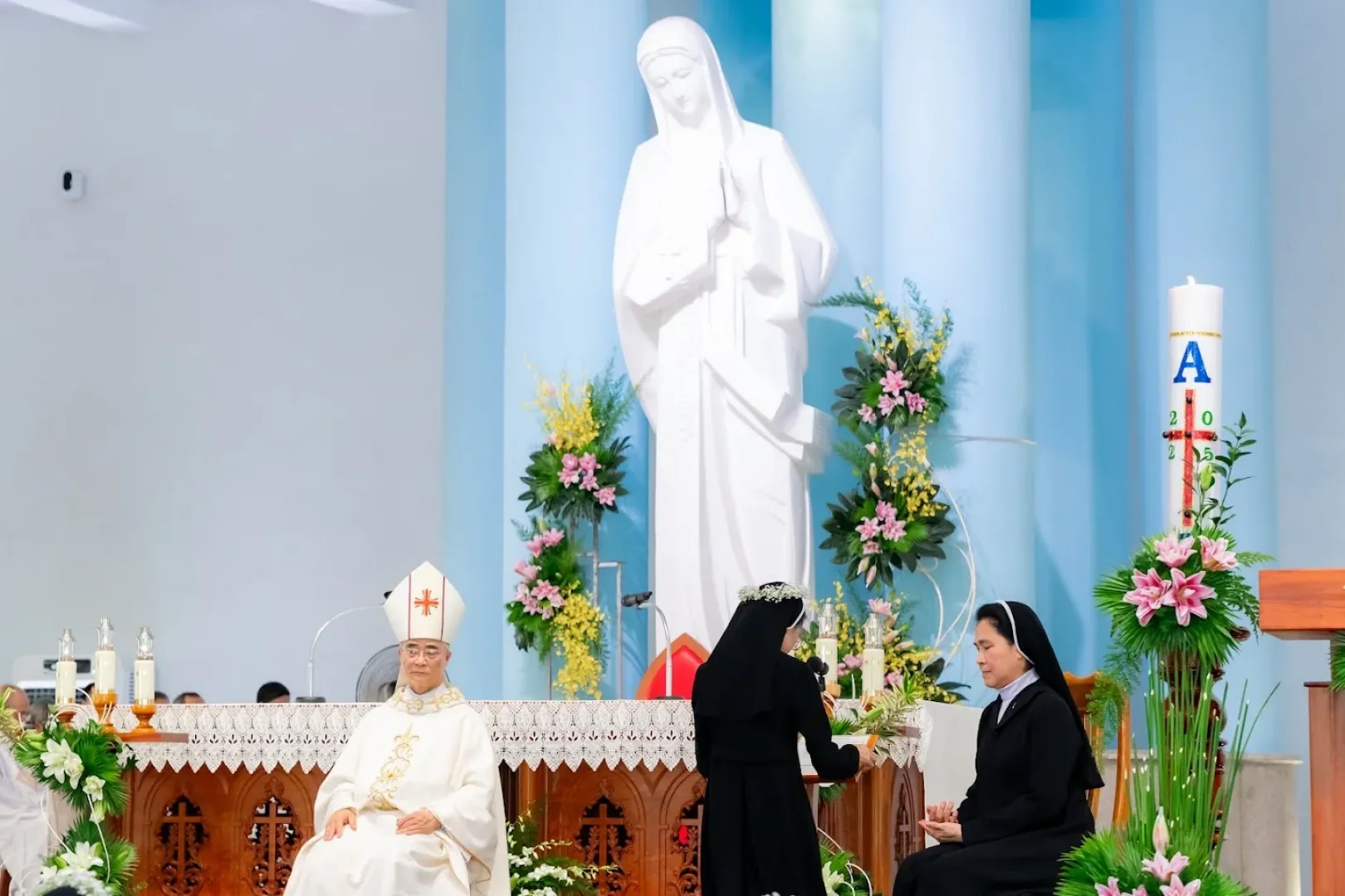 Sau những phút đón tiếp nói cười hân hoan, buổi tâm ca mời gọi cộng đoàn lắng đọng tâm hồn để đúng 9g00, bài ca nhập lễ dặt dìu nâng bước mọi người vào phụng vụ thánh lễ. Cùng đồng tế với Đức cha Đaminh, Giám mục Giáo phận Đà Lạt là hơn 130 Linh mục từ các giáo phận. Hiện diện trong Thánh lễ Tuyên khấn có đông đảo quý Tu sĩ nam nữ, quý ông bà cố, quý ân, thân nhân và quý khách xa gần.