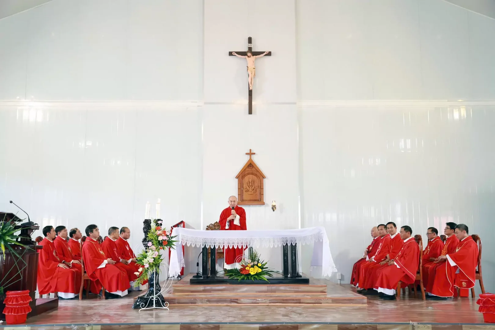 Trước thánh lễ Cha Quản hạt làm phép Nhà nguyện và sau bài giảng, Cha làm phép Bàn thờ.
