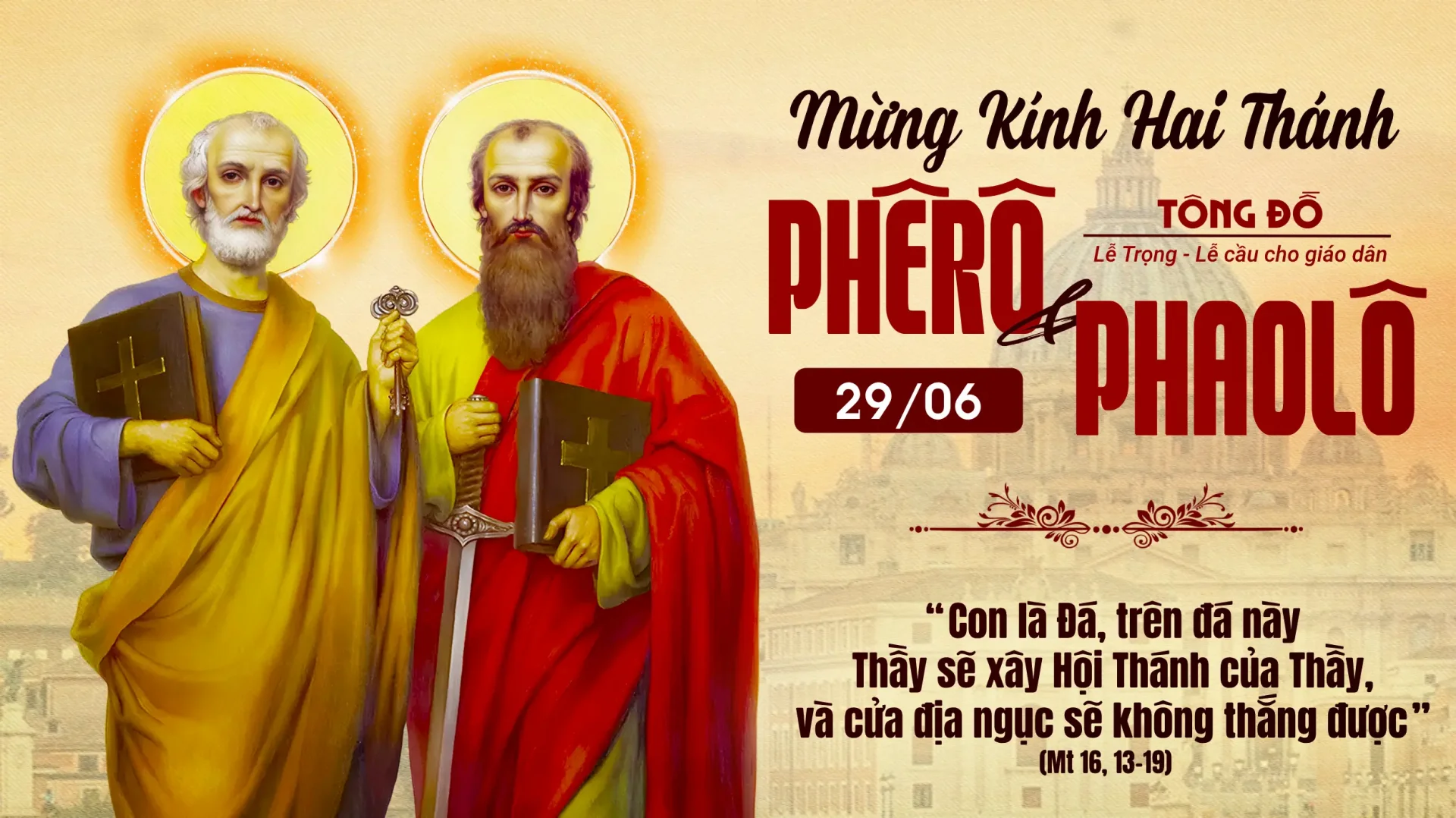Câu Tung Hô Tin Mừng, mà các nhà phụng vụ đã chọn cho ngày lễ hôm nay là: Anh là Phêrô, nghĩa là Tảng Đá, trên tảng đá này, Thầy sẽ xây Hội Thánh của Thầy, và quyền lực tử thần sẽ không thắng nổi. Trong bài Tin Mừng, Đức Giêsu nói với thánh Phêrô: Thầy sẽ trao cho anh chìa khóa Nước Trời: dưới đất, anh ràng buộc điều gì, trên trời cũng sẽ ràng buộc như vậy; dưới đất, anh tháo cởi điều gì, trên trời cũng sẽ tháo cởi như vậy. Chính vì là đại diện duy nhất của toàn thể Hội Thánh, nên thánh Phêrô xứng đáng được nghe Chúa nói: Thầy sẽ trao cho anh chìa khóa Nước Trời. Không phải một cá nhân, nhưng cả Hội Thánh duy nhất đã lãnh nhận chìa khóa này. Do đó, địa vị nổi bật của thánh Phêrô được đề cao, vì chính ngài tiêu biểu cho đặc tính phổ quát, và duy nhất của Hội Thánh. Ước gì khi mừng lễ hai thánh Tông Đồ, chúng ta biết quý chuộng đức tin, đời sống, công lao khó nhọc và những khổ hình của các ngài, biết quý chuộng những lời các ngài tuyên xưng, và những điều các ngài rao giảng, hầu chúng ta có thể trung thành tuân giữ lời các ngài giảng dạy. Ước gì được như thế!