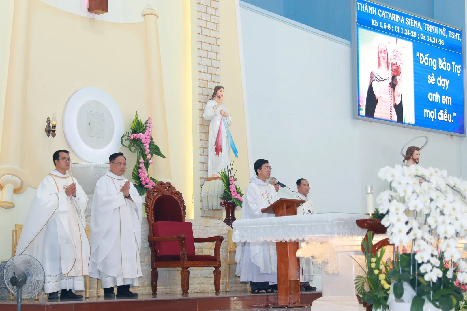 Trong bài giảng, Cha Phêrô Mai Vũ Quốc Duy, nhấn mạnh những nhân đức nổi bật của Thánh nữ Catarina. Ngay từ thuở bé, Chị Thánh đã dâng hiến cuộc đời mình cho Chúa, sống chiêm niệm, yêu mến Kinh Thánh và rao truyền Lời Chúa khắp nơi. Với quá trình nên Thánh theo mô hình ba bậc: bậc thứ nhất là tâm hồn từ bỏ sự yêu mến, bậc thứ hai là lấy đức ái nơi cạnh sườn Chúa Giêsu và bậc thứ ba là nên một với Chúa Giêsu. Tiếp theo bài chia sẻ, dựa vào đoạn Tin mừng “Ai yêu mến Thầy thì sẽ giữ lời Thầy, Cha của Thầy sẽ yêu mến người ấy”, Cha Phêrô đã mời gọi cộng đoàn yêu mến Chúa và cũng yêu chính anh em của mình bằng cách sống theo những linh đạo mà Người đã đề ra, noi gương đời sống thánh thiện đạo đức của Chị Thánh Catarina trong ơn gọi Huynh đoàn Đaminh.