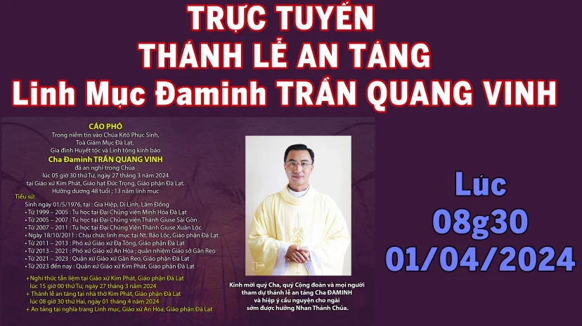 Trực tuyến Thánh Lễ An Táng Linh mục Đaminh Trần Quang Vinh. Phát lúc 08g30. Thứ Hai 01/04/2024 31/03/2024