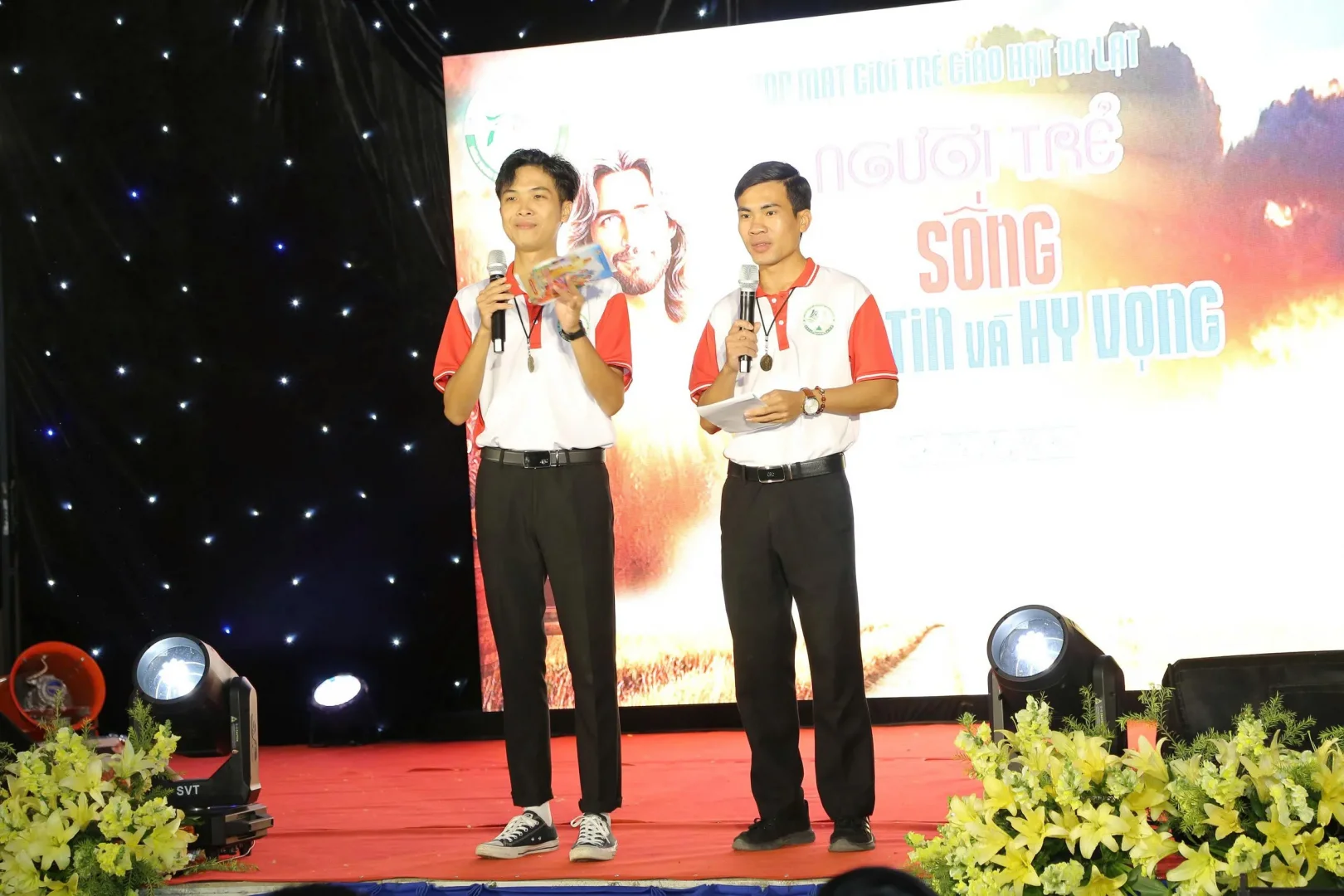 Giữa chương trình, hai MC Hữu Huân và Yến Vũ thực hiện những câu hỏi ĐỐ VUI giúp các bạn trẻ hiểu hơn về Năm Thánh 2025, về Giáo phận Đà Lạt và 70 năm Gíao xứ Thánh Mẫu.