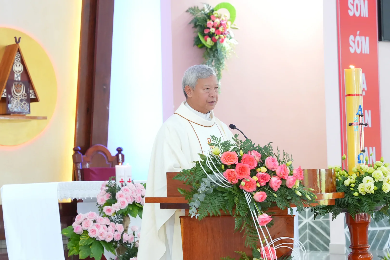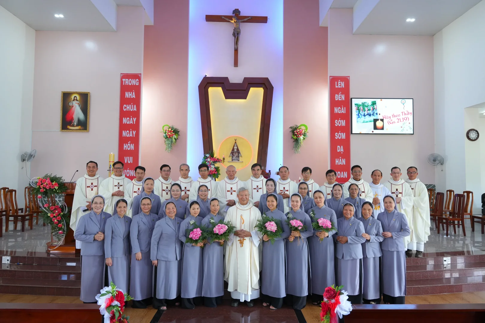 Thánh lễ Gia Nhập Vĩnh Viễn và mừng Ngân Khánh được Đức cha Đaminh Nguyễn Văn Mạnh, Đấng Bản Quyền Tu Hội chủ tế. Rất đông đảo quý Cha đồng tế, thân nhân và quý khách của chị em cùng tham dự Thánh lễ. Qua lời giáo huấn trong bài giảng, Đức cha Đaminh đã nhắn nhủ chị em: “Trong lời khấn hôm nay, chị em cũng được mời gọi trở nên người yêu trung thành của Chúa Kitô, tình yêu này không giống bất kỳ tình yêu nào trong đời, bởi không dựa trên cảm xúc mà trên cam kết, không theo cảm hứng mà theo thập giá, không tìm sự dễ dàng mà chọn con đường của trung tín và tự nguyện.”