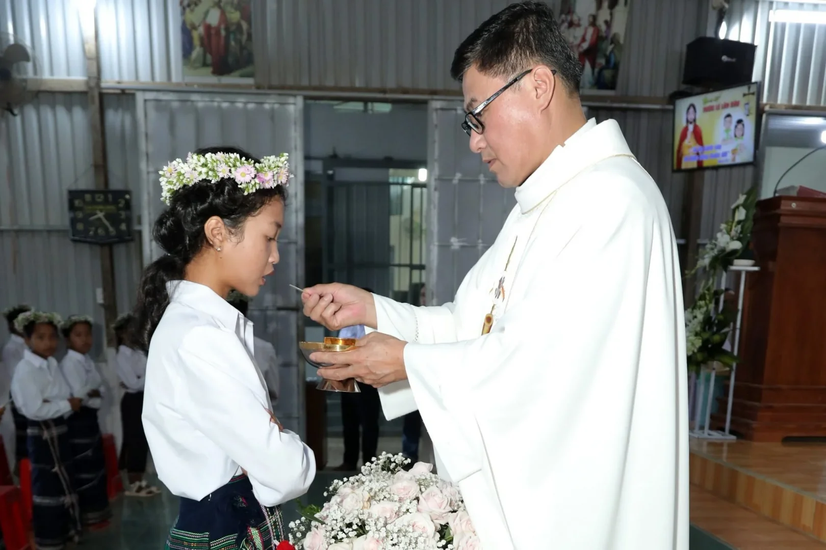 Sau ba năm học giáo lý theo tiến trình để lãnh nhận Bí tích Hòa Giải và Rước Lễ Lần Đầu, 58 em thuộc khối sơ cấp I và II của Giáo họ Tà Năng đủ điều kiện để lãnh nhận Bí tích Thánh Thể lần đầu trong cuộc đời.