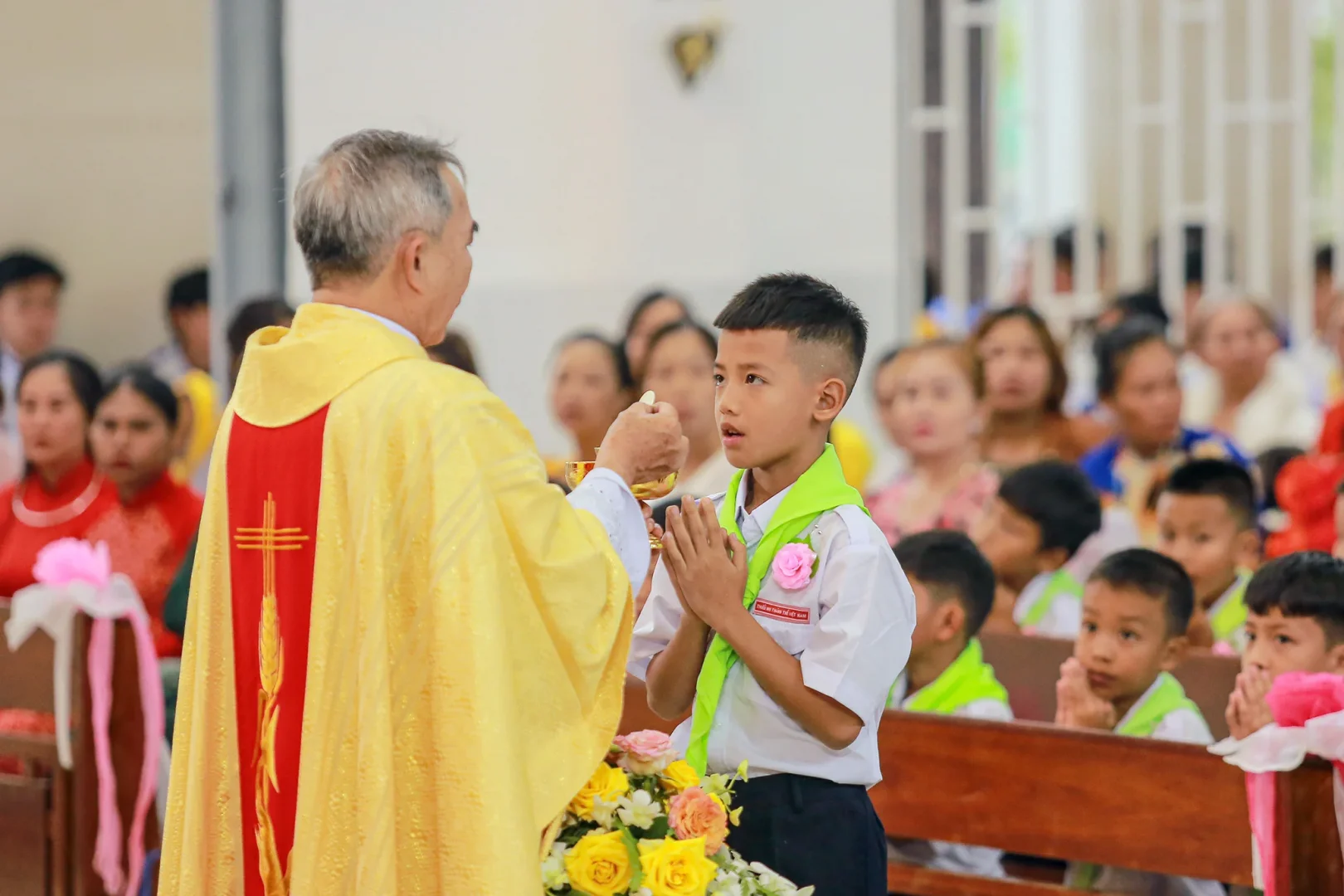 Tiếp đến phần hiệp lễ, các em được rước Chúa Giêsu Thánh Thể lần đầu tiên ngự vào trong tâm hồn, để từ đây các em được gắn kết mật thiết với Chúa trong Bí tích Tình yêu.