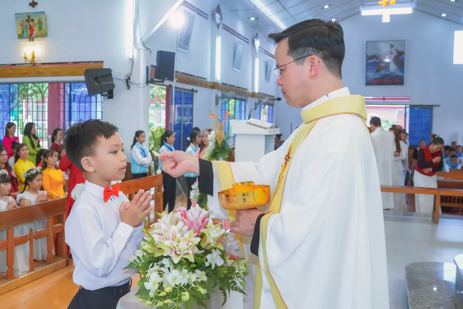 Lúc 07g00 sáng Chúa nhật ngày 22/06/2025, trong bầu khí thánh thiện và trang nghiêm, Cha Quản xứ Giuse Trần Văn Mạnh đã long trọng cử hành Thánh Lễ trao ban Mình Máu Thánh Chúa lần đầu tiên cho 49 em đã học xong Chương trình Giáo Lý Sơ Cấp II.