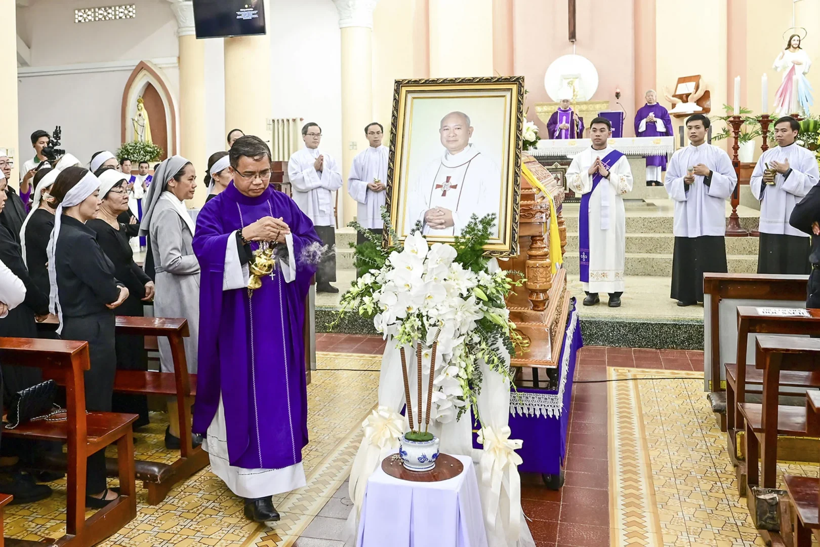 Trước đó, vào lúc 8g00, linh cữu Cha Cố được di chuyển từ nhà hưu dưỡng Linh mục sang nhà thờ Giáo xứ.
