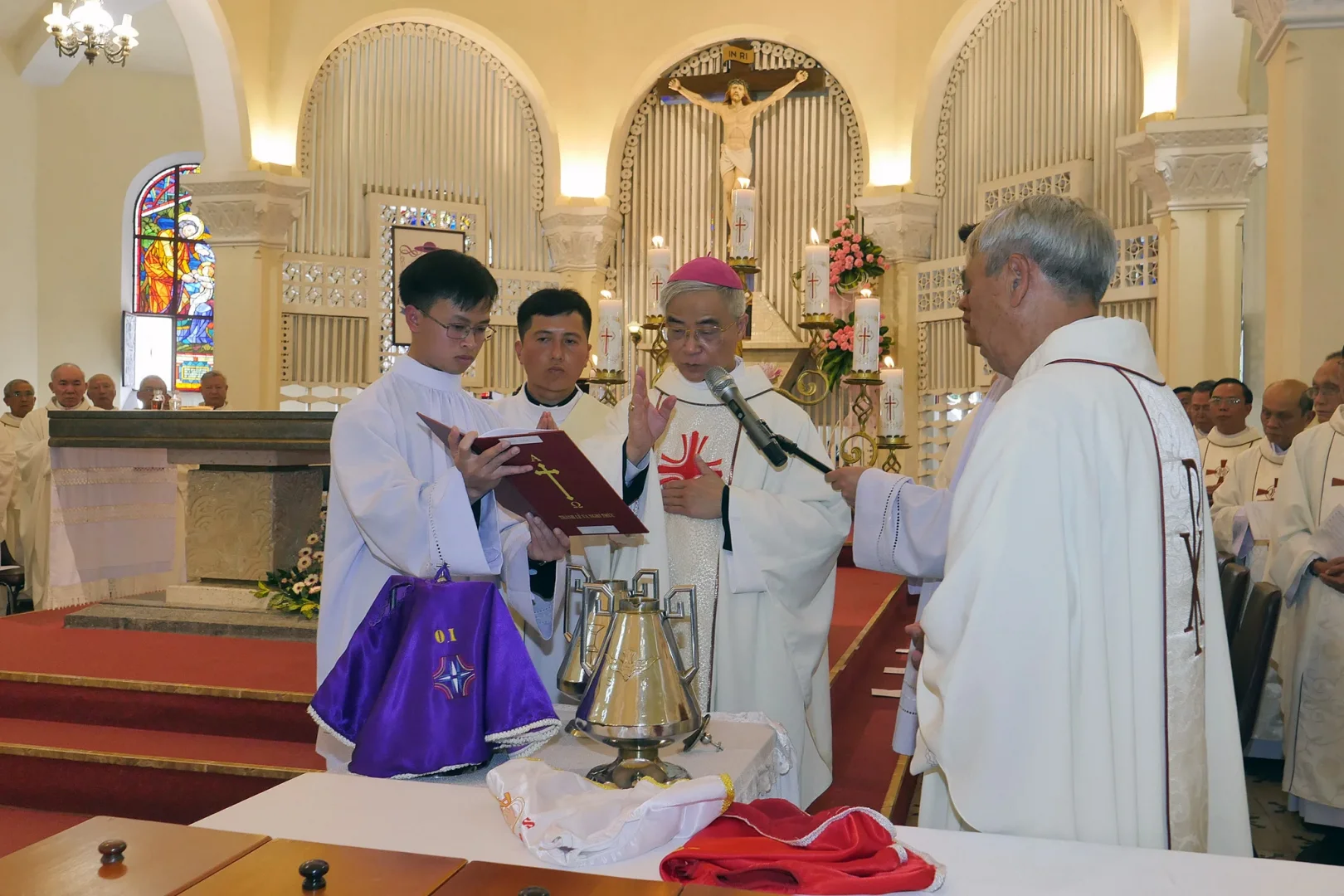 Đức cha làm phép các loại dầu Dự Tòng, dầu Bệnh Nhân, pha thuốc thơm và hà hơi vào dầu Thánh, dấu chỉ Ơn Chúa Thánh Thần. Linh mục đoàn cùng đặt tay hướng về Dầu Thánh khi Đức cha đọc lời nguyện thánh hiến.