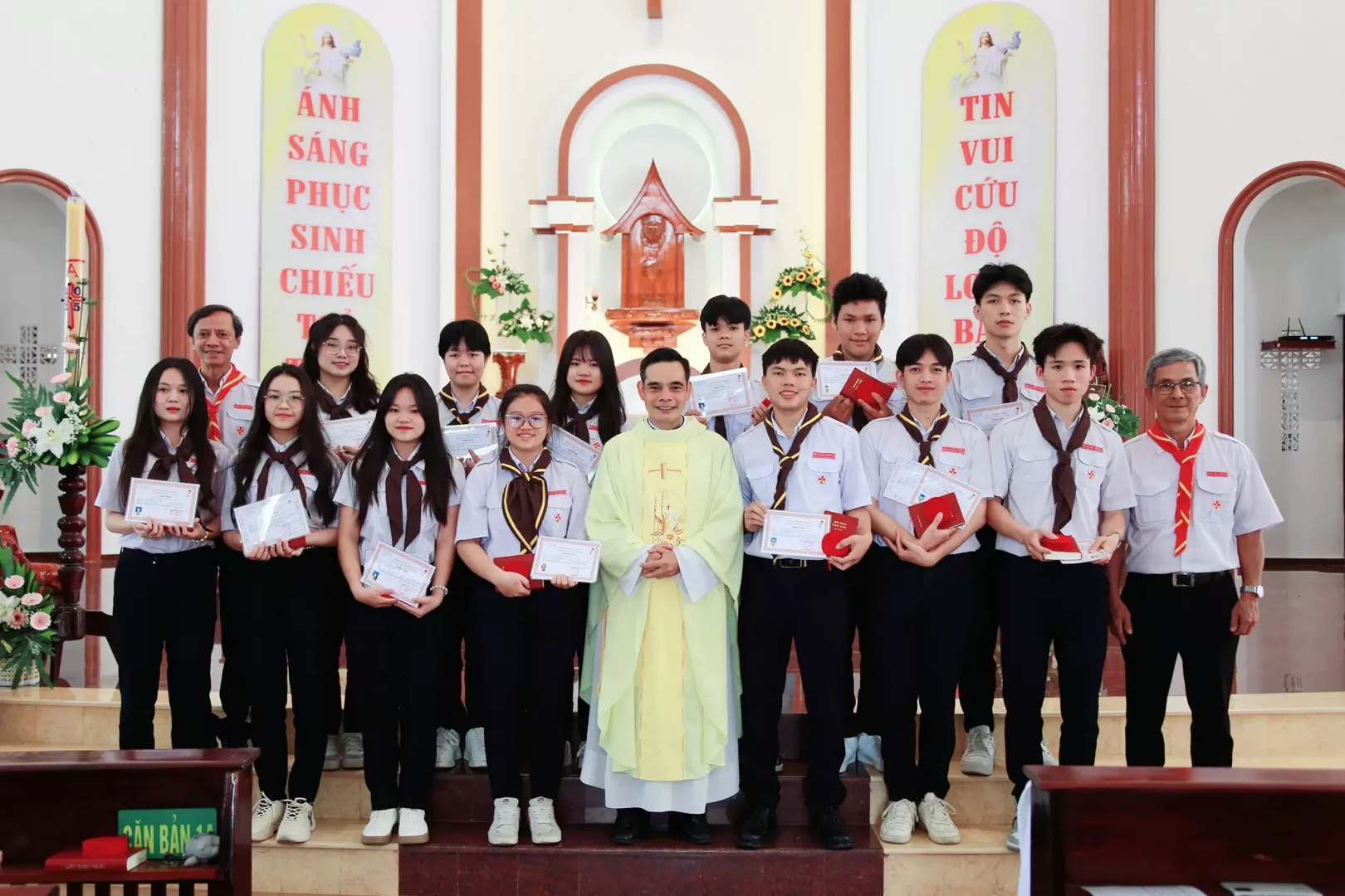 Sáng Chúa nhật 20/4/2025, trong bầu khí hân hoan mừng Chúa Phục Sinh cùng toàn thể Hội Thánh, Xứ đoàn Mẹ Vô Nhiễm Giáo xứ Tân Hóa cử hành thánh lễ với nghi thức Lên Đường cho các em Chi đoàn Hiệp Sĩ II.